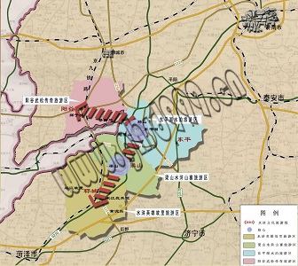 《水浒传》做为我国四大古典文学名著中最具有广泛民众基础的文学名著,以其丰满的人物和震撼人心的故事情节流传久远,其故事的主要背景地分布在山东西部以梁山为中心的地域范围内,主要包括梁山、东平、高唐、郓城和阳谷五县。五县地域相连,处于鲁西,属经济欠发达区。一部《水浒传》使它们共同形成了一种独特的水浒文化,当地的生产生活习惯、民间艺术、民众性格等具有典型的古朴、侠义的水浒遗风。梁山位于梁山县城东南隅,北宋时期,晁盖、宋江等英雄好汉据守梁山,杀富济贫,“替天行道”,至今仍保留着许多古迹。施耐庵所著《水浒传》一再铺陈渲染,遂使梁山名扬天下。梁山县是山东省水浒旅游开发最早的区域,水泊梁山风景区是山东省政府 1985 年公布的首批省级风景名著区,在 2009年晋级国家 AAAA级旅游区,主要景点包括宋江寨、黑风口、黑风亭、杏花村、右军寨,左军寨、后军寨、断金亭、练武场、赛马场、比武场、观武台、点将台等。