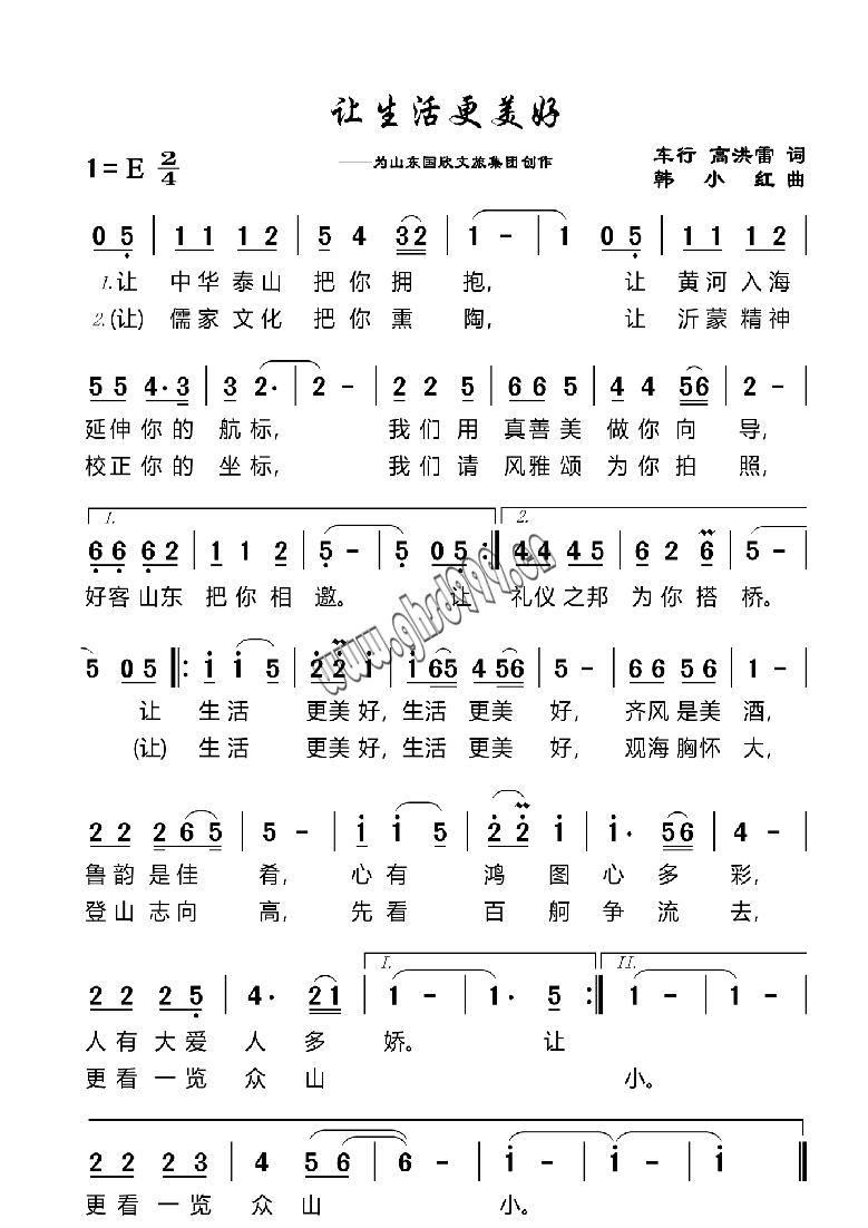 《让生活更美好》是由国欣文旅携手一线艺术创作团队共同打造的一首悦耳动听的抒情歌曲,由空军政治部文工团创作室主任、中国音乐文学学会副主席车行,鲁商集团党委书记、董事长兼国欣文旅党委书记、董事长高洪雷作词,青年作曲家韩小红作曲。