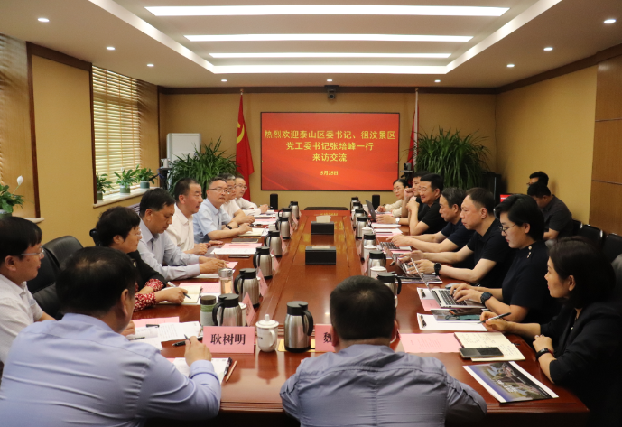 5月25日,泰安市泰山区委书记、徂汶景区党工委书记张培峰率队到山东文旅集团座谈交流,集团党委书记、董事长高洪雷会见。山东文旅集团党委副书记、总经理丁艺,泰安市泰山区委副书记、区长周鹏飞参加会谈。
