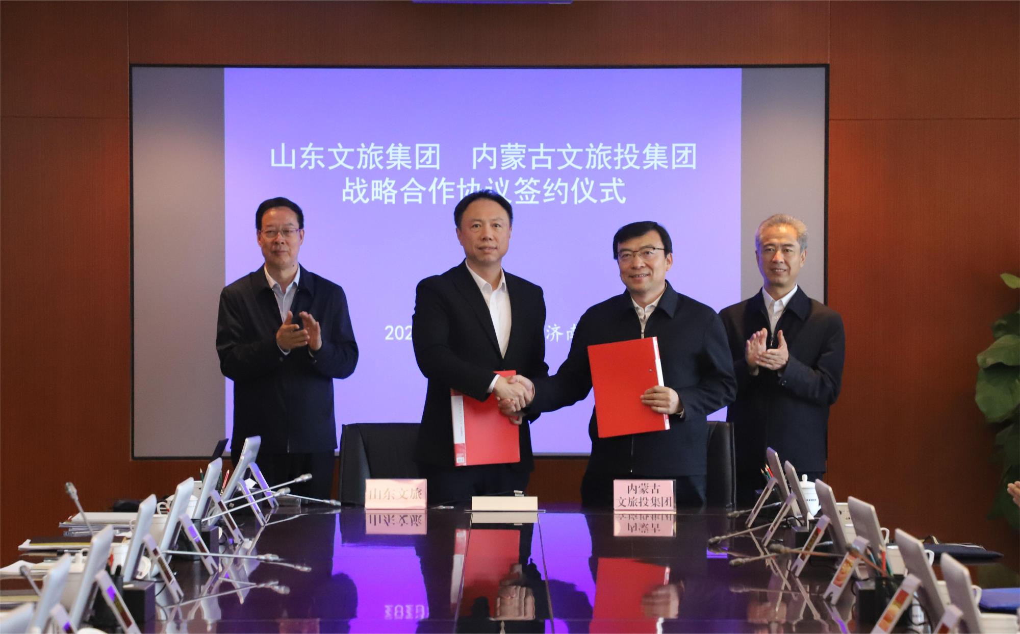 会前,山东文旅集团同内蒙古文旅集团在山东省国资委同内蒙古国资国企座谈会上签订战略合作协议,双方将基于各自核心竞争力,依托两地丰富的自然和文化旅游资源,在景区管理、酒店运营、定制旅行、数发科技、乡村振兴等领域积极探索综合服务新模式。