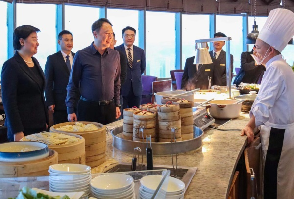 丁艺询问了怡豪大饭店更名后的运营情况,并对自有高端品牌的推出以及相关经营管理工作予以肯定。在实地考察过程中,丁艺一行参观了大堂、客房、宴会厅、银顶旋转餐厅等主要经营部位,重点检查了消防、电梯等安全设施,并对下一步工作提出具体要求。