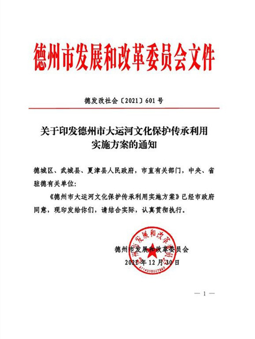 1月11日, 山东文旅集团旗下山东省旅游工程设计院有限公司(以下简称“省旅游设计院”)编制的《德州市大运河文化保护传承利用实施方案》(以下简称“《方案》”)经德州市政府同意,由德州市发改委正式印发。省旅游设计院助力德州市在山东省运河沿线五个地级市中率先出台实施方案,标志着大运河国家文化公园(山东德州)和德州市大运河文化带建设进入快车道。
